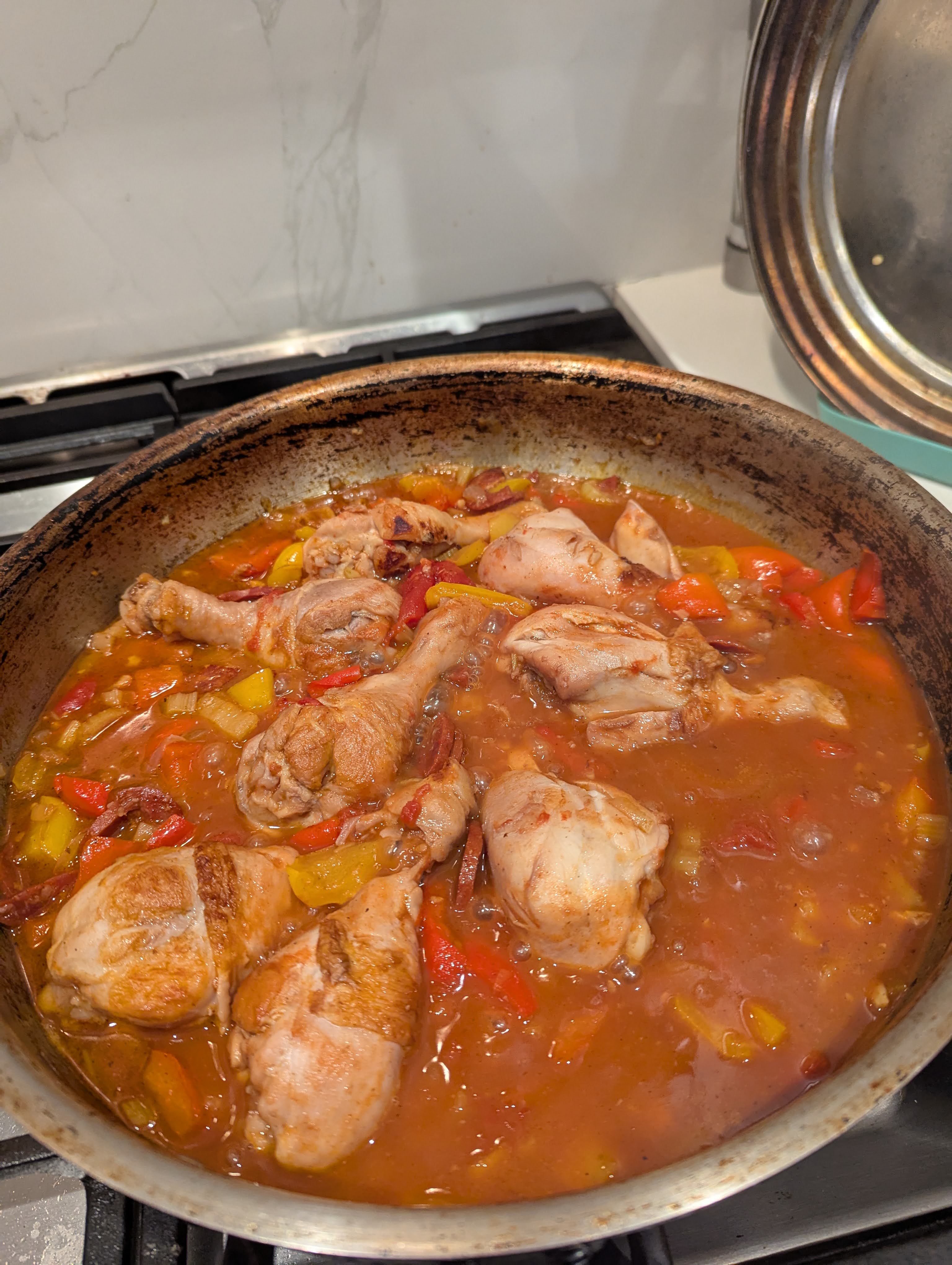 bring to a simmer. Turn heat to medium low, place the chicken legs in the pot, loosely cover with a lid, and simmer for 1 hour. The chicken should be tender but not so long that it’s falling of the bone.